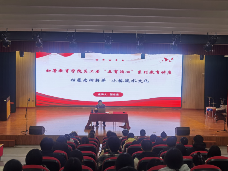 11月20日下午,初等教育学院关工委在智贤楼小剧场举办“五育润心”系列讲座,学院关工委副主任张志连以《枯藤老树新芽·小桥流水文化——校园文化之管窥》为题,为200余名师生代表作专题报告,将百年校史与时代精神熔铸于校园肌理。