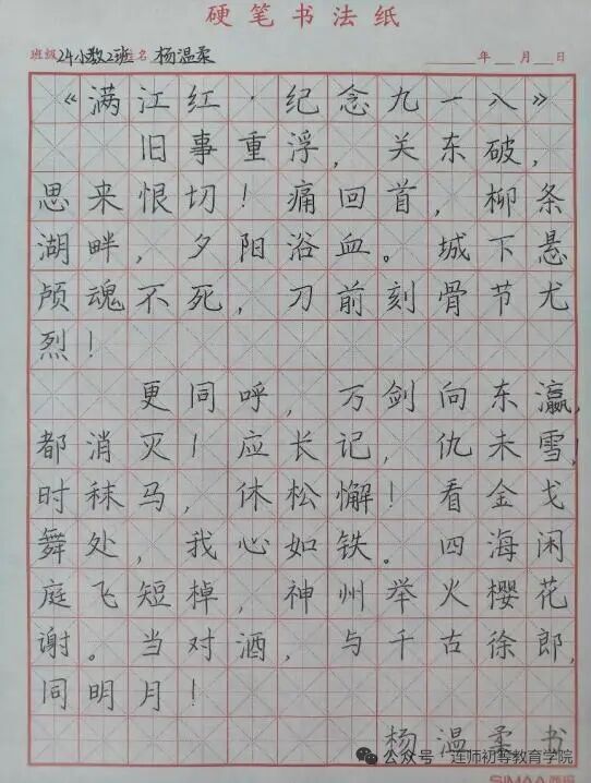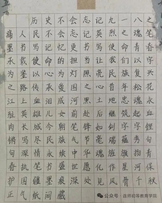 此次活动以中华优秀传统文化为载体,实现了书法艺术与爱国主义教育的深度融合——既深切缅怀了“九一八”事变中牺牲的革命先烈,又传承与弘扬了中华优秀传统文化的魅力。未来,初等教育学院将持续探索“文化+思政”的育人模式,打造兼具思想性、艺术性与教育性的活动品牌,引导同学们在文化熏陶中筑牢爱国根基、涵养人文素养,成长为有理想、有本领、有担当的新时代教育后备力量。