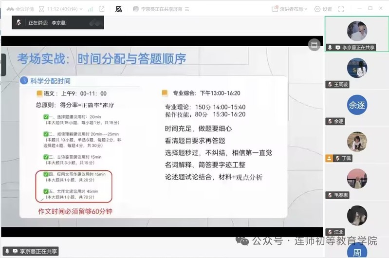 3月10日,初等教育学院专转本考前动员暨备考经验交流分享会在线上顺利举行。活动特邀2025届毕业生华雪和李京蔓担任主讲嘉宾,围绕考前冲刺复习、考场实战技巧、心理调适方法三大核心内容,为正在冲刺备考的同学们带来了一场实用性极强的经验分享会,以朋辈力量护航学子逐梦之路。