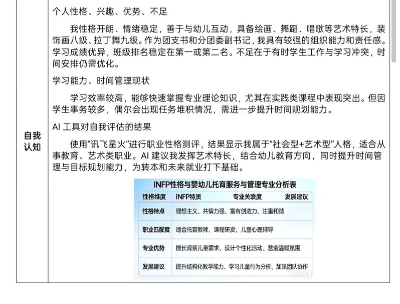 活动开展期间,参赛学子们巧用DeepSeek、讯飞星火、豆包等AI平台,完成人格测评、职业匹配分析,为生涯规划提供依据。依托MBTI人格特质分析理论,有的参赛者锚定“有温度的小学教育者”发展方向,将教育初心与学科教学深度融合;有的参赛者结合“社会型+艺术型”人格特点,规划“艺术素养+幼儿教育”融合发展路径。借助AI工具的深度分析与专业建议,同学们跳出传统规划思维,将抽象的职业理想转化为具体、可行的职业规划,从学业提升、能力培养、实践锻炼等多维度制定学习目标,细化核心任务。同时针对教师资格证考试、学业与学生工作平衡、时间管理等问题做好全面风险预判,并运用AI智能分析制定科学有效的应对策略。经评审,最终评选出一等奖5名,二等奖10名,三等奖15名。