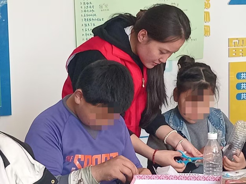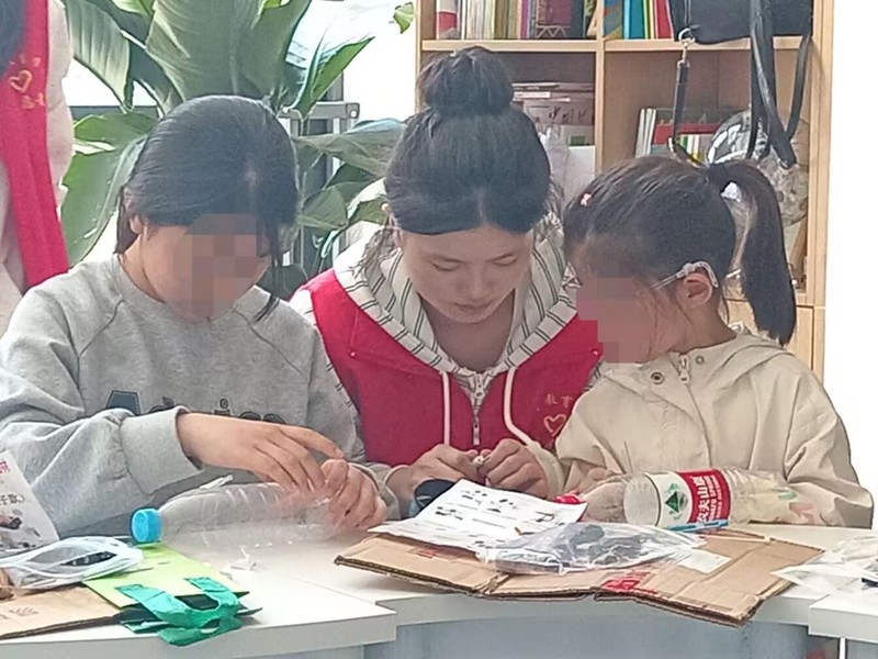活动当天上午,志愿者们围绕青少年心理健康需求,开展了温馨的“树洞” 交流活动。面对20余名儿童,志愿者们以温馨亲切的沟通方式,通过互动提问的方式,引导他们倾诉日常烦恼、困惑与小小心愿,在轻松舒缓的氛围中给予情绪疏导与正向引导,为孩子们的心灵撑起一把温暖的 “保护伞”。下午,活动转向环保创意手工课堂。志愿者们带领孩子们利用废旧塑料瓶、电池、轮子等材料,动手制作可移动的塑料瓶小车。活动中,志愿者们分工协作,细致讲解制作步骤与环保知识,手把手指导孩子们裁剪、拼接、组装。原本即将被丢弃的废旧物品,经过奇思妙想与巧手改造,成为一辆辆灵动可爱的环保小车。孩子们在实践中收获乐趣,提升了动手操作能力,直观感受循环利用的意义。